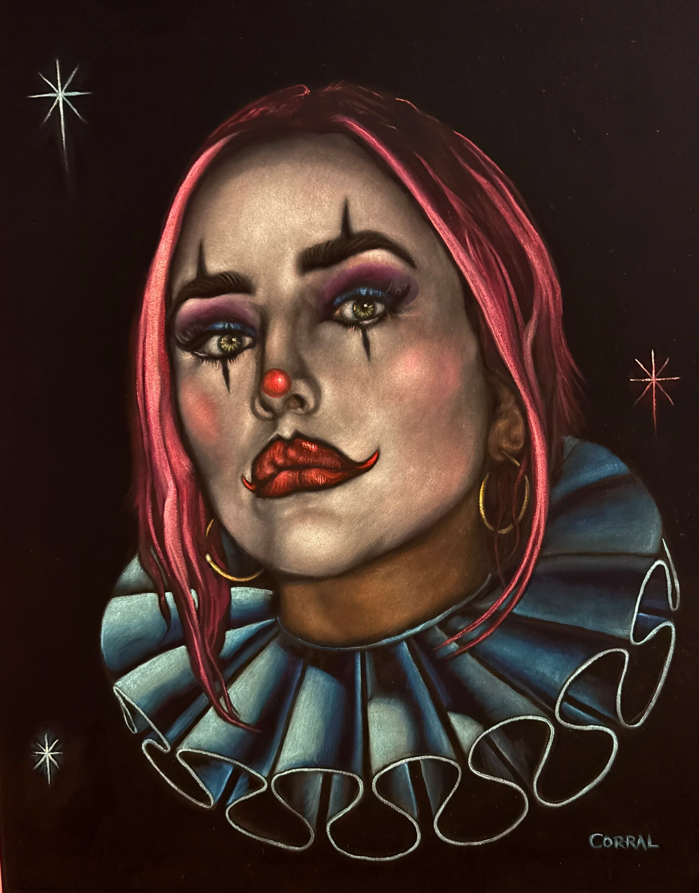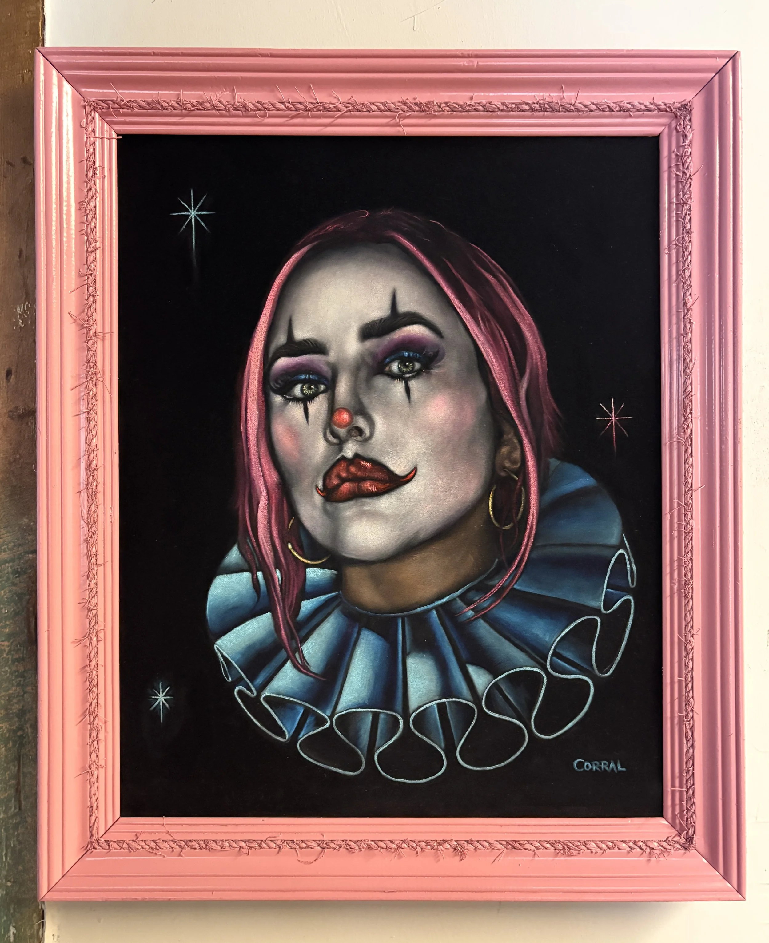 new work / harlequin clown /November 7, 2025 by coco corral commissioned custom portrait. created vintage clown look over a submitted non-clown photo.
